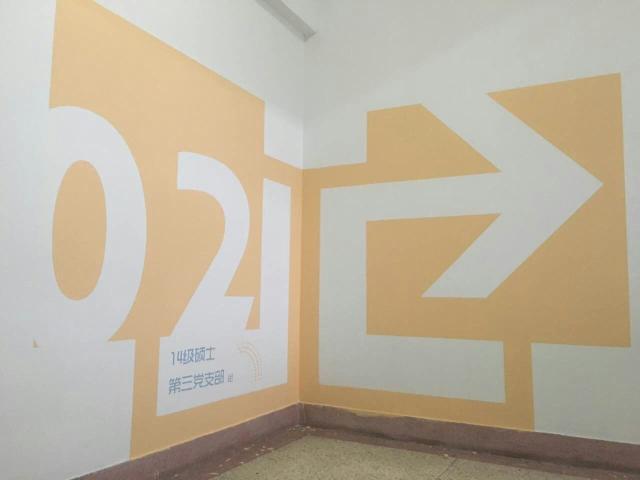 周末,同学们手拿铅笔、丁尺,忙碌在一到五层的楼梯口处。墙上线稿绘制结束后,同学们又化身粉刷匠,为白色的墙壁添上不同的色彩。同学们虽不是艺术出身,却一点也不逊色。从一楼到五楼,黄色、橙色、绿色、蓝色、紫色,每一种颜色让人眼前一亮,带来一天的好心情。最后,在楼层标识的一角,同学们还留下了自己集体的独特印记。