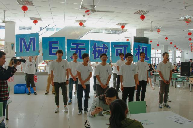 舞蹈时间半小时前,快闪团队就已经齐聚食堂,并开始积极地准备。舞蹈组同学们装作无辜“路人”吃饭聊天玩手机,时刻准备着听音而动。同时,食堂各个门口也开始宣传即将发生的神秘事件,看得出,在今天的明媚阳光下,同学们都热情满满也期待满满。食堂如往常般的平静外表下早已暗潮涌动。随着鼓点明显的前奏开始,食堂突然迸发出音乐,周围吃饭及排队的同学们先是一惊,紧接着,一群白衣灵魂舞者从四面八方缓步迈进食堂中的一块空地,同学们恍然大悟后又是一喜;坐着吃饭的同学们也抬起头关注这次活动,还伴有时不时的讨论;站着等待的同学们也缓缓聚集过来,以一个更好的视角欣赏这一次活动舞蹈。不少人拿出手机,记录下这舞动的一刻。音乐间奏中,6名同学高举“ME无械可击”的标识在舞者之间穿插走过,迎来阵阵掌声。舞毕,参演者齐呼“百年机械,生日快乐!”完成献礼。