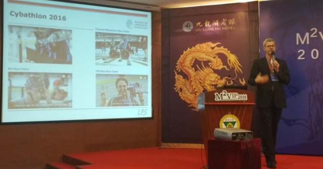 德国达姆斯塔特大学运动生物力学系Andre Seyfath教授紧接着对将生物力学概念运用于机器人辅助设备作了有趣的主旨报告。Seyfarth教授大胆提出以摆腿收缩实现对稳定跑动的简明控制策略和基于质量-弹簧模型的步态稳定研究方法。具体分析了全局腿函数、协同腿函数与稳定行走和平衡跑动的关系,并向参会者视频展示了由他们团队开发精妙的PAKO(PoweredAnkle-Knee Orthoprosthesis)矫形假肢系统。