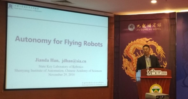 中科院沈阳自动化所机器人学国家重点实验室副主任韩建达教授首先作了“自主飞行机器人”的主旨报告。探讨了自主飞行机器人的决策优化和应对未知环境的需要,提出了一种对空气动力学未知信息进行主动建模和自我诊断算法,并对多机协调动力学进行了理论分析。另外,韩教授对自主飞行机器人在国家电力系统电缆检测和安装以及精密农业等重要领域的应用展开了系统的介绍,展望了自主机器人在极地、sEMG信号识别和康复、以及微创手术等新兴领域的前景。
