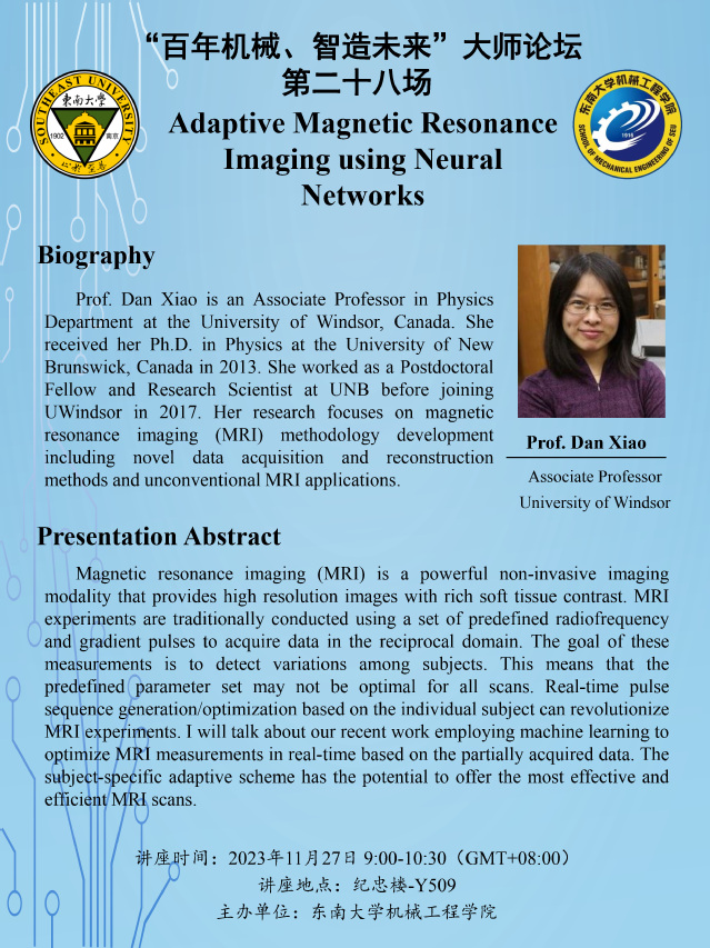 Prof. Dan Xiao is an Associate Professor in Physics Department at the University of Windsor, Canada. She received her Ph.D. in Physics at the University of New Brunswick, Canada in 2013. She worked as a Postdoctoral Fellow and Research Scientist at UNB before joining UWindsor in 2017. Her research focuses on magnetic resonance imaging (MRI) methodology development including novel data acquisition and reconstruction methods and unconventional MRI applications.