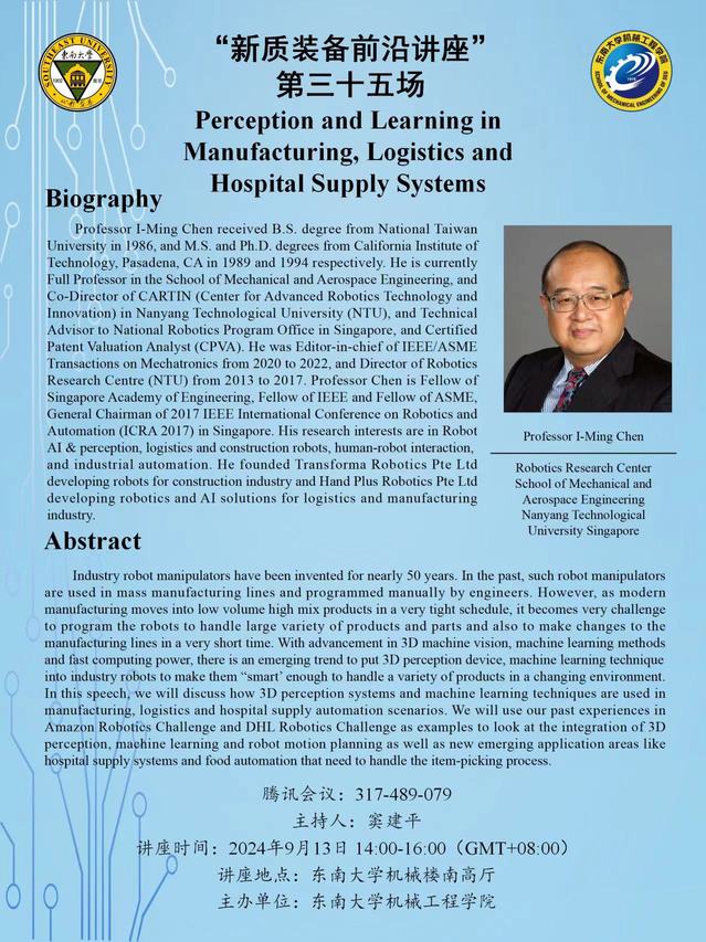 “新质装备前沿讲座”第三十五场:Professor l-Ming Chen——Perception and Learning inManufacturing, Logistics andHospital Supply Systems