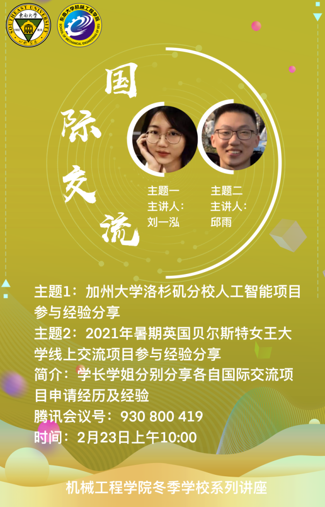 223日上午,参与加州大学洛杉矶分校人工智能项目的刘一泓学姐和参与2021年暑假英国贝尔斯特女王大学线上交流项目的邱雨学长分别对各自项目进行了经验分享。刘一泓学姐主要对自己的短期交流项目的过程进行了详细概括,从线上的授课环节到线下的参观交流环节,并在此之后简要介绍了自己的申报流程及经验。邱雨学长则是从自己的申请经历开篇,对自己的线上交流体验进行了分享,并给予同学们关于申请项目的一些建议。本次讲座不仅让同学们对于短期交流项目进行了简单了解,也让同学们得到了一些经验与阅历,也相信同学们在以后的申请项目时会仔细认真,避免出错。