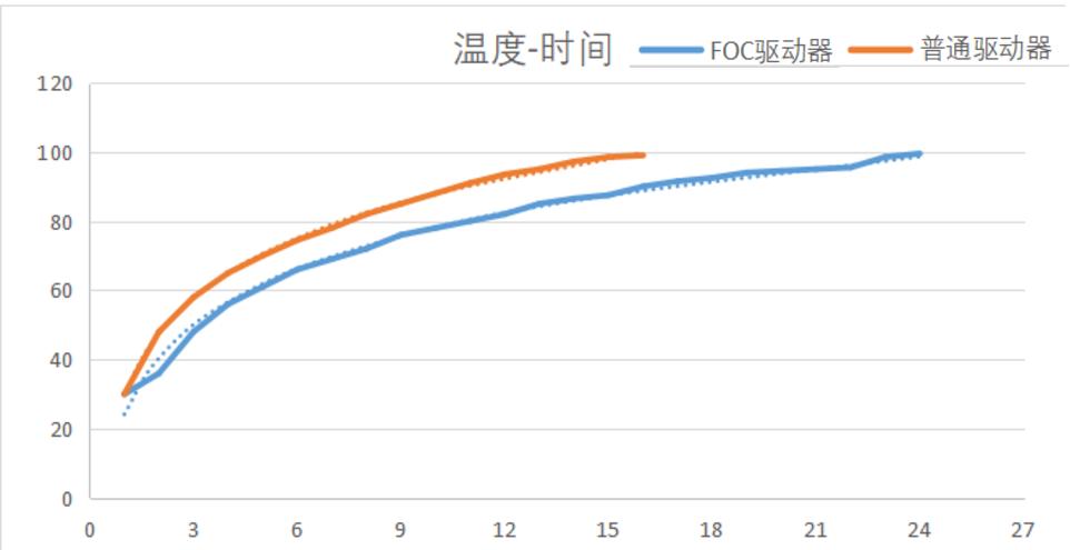 在相同扭矩为0.2NM的情况下,普通驱动器在15min内温度由室温提升到100摄氏度;而FOC驱动器在24min内温度由室温提升到100摄氏度。由此可见,FOC驱动器能够提高电机持续工作的时间,提升比例为60%